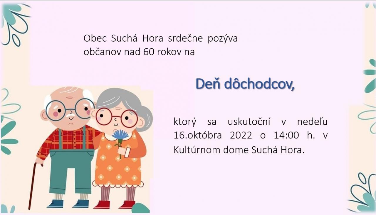 Obec Suchá Hora pozýva občanov nad 60 rokov na "Deň dôchodcov", ktorý sa uskutoční v nedeľu 16.10. 2022 o 14. hod. v Kultúrnom dome Suchá Hora.