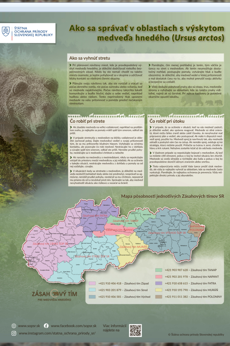Štátna ochrana prírody Slovenskej republiky zároveň vyzýva turistov a návštevníkov prírody v oblastiach s výskytom medveďa hnedého k zvýšenej opatrnosti. Všetky potrebné informácie o bezpečnosti a odporúčania ako sa správať v miestach s výskytom medveďa hnedého nájdete na našej web stránke https://zasahovytim.sopsr.sk/bezpecnost/.