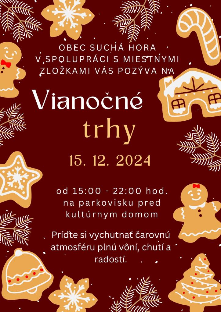 Obec Suchá Hora v spolupráci s miestnymi zložkami Vás pozýva na Vianočné trhy 15.12.2024, od 15:00 do 22:00 hod. na parkovisku pred kultúrnym domom. Príďte si vychutnať čarovnú atmosféru plnú vôní, chutí a radosti.